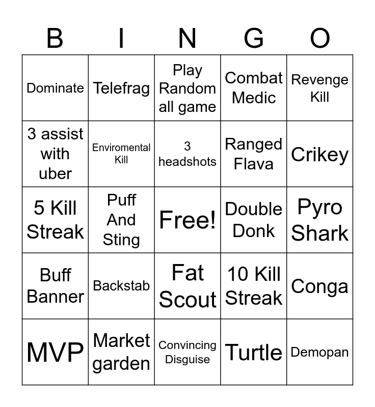 This bingo card has a free space and 24 words: Backstab, Market garden, 3 headshots, MVP, Revenge Kill, Dominate, 3 assist with uber, Telefrag, Double Donk, Fat Scout, Ranged Flava, 5 Kill Streak, 10 Kill Streak, Conga, Enviromental Kill, Turtle, Pyro Shark, Play Random all game, Crikey, Puff And Sting, Demopan, Buff Banner, Combat Medic and Convincing Disguise.