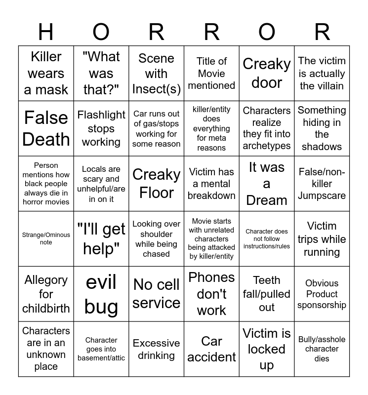 This bingo card has 63 words: Free!, Phones don't work, "I'll be right back", "I'll get help", Characters are in an unknown place, "Did you see that?", "What was that?", Lights shut off, Flashlight stops working, Victim makes noise while hiding, False/non-killer Jumpscare, Oh no door is locked! D:, Creaky Floor, Creaky door, Bathroom scene, The victim is actually the villain, Something hiding in the shadows, Killer wears a mask, Victim accused of lying/overthinking, Car runs out of gas/stops working for some reason, It was a Dream, Victim has a mental breakdown, Title of Movie mentioned, Obvious Product sponsorship, Ominous TV/Radio Static, Car accident, Character goes into basement/attic, Phone battery is dead, No cell service, Bully/asshole character dies, At a resort or getaway/on vacation, Terrible audio mixing, Unnecessary monster reveal, Firearm jams/safety is on, killer/entity does everything for meta reasons, Looking over shoulder while being chased, Law enforcement is useless/actively makes things worse, Victim trips while running, Victim is locked up, False Death, Characters realize they fit into archetypes, Locals are scary and unhelpful/are in on it, Character backs up into grave danger, “Last girl” dies at the end / PCS, Person mentions how black people always die in horror movies, Movie starts with unrelated characters being attacked by killer/entity, Allegory for childbirth, Strange/Ominous note, Unusual body fluid, It was a hallucination, Character suffers grave consequence of their own actions, Character does not follow instructions/rules, Teeth fall/pulled out, Bad special effects, Inaccurate science, Scene with Insect(s), Unnatural body movement/contortion, Excessive drinking, Excessive drugs, Hospital scene, Strange phonecall/text, evil bug and Baby who engages in Diabolism.