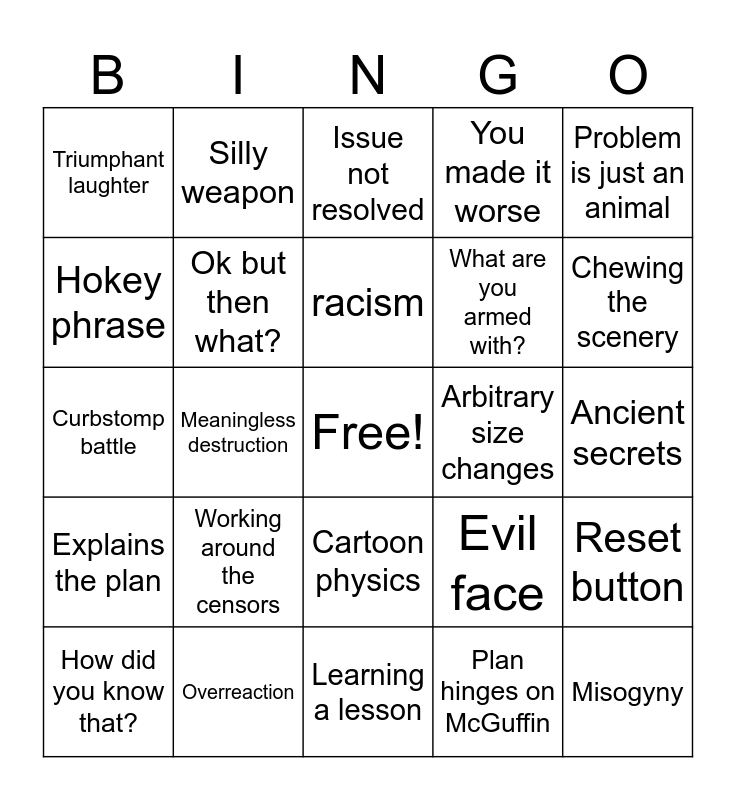 This bingo card has a free space and 43 words: Colour bleed, Misogyny, Racism, How did you know that?, Convoluted villain plot, Plan hinges on McGuffin, Issue not resolved, Problem is hero/bystander fault, Problem is just an animal, Overreaction, You made it worse, Arbitrary size changes, Cartoon physics, Working around the censors, Multipurpose levers/buttons!, Learning a lesson, Hero sadism, Curbstomp battle, Arbitrary stupidity, Chewing the scenery, Silly weapon, Weird Science, How did you understand that?, Triumphant laughter, Obvious political commentary, Ancient secrets, Animal mascot hijinks, Hidden villain/sudden betrayal, Evil face, Explains the plan, Universal experts, Reset button, Authorities are useless, Meaningless destruction, Damsel in distress, Hokey speech/dialogue, All your eggs in one McGuffin, racism, Hokey phrase, What are you armed with?, silly vehicle, Ok but then what? and Well that's just dumb.