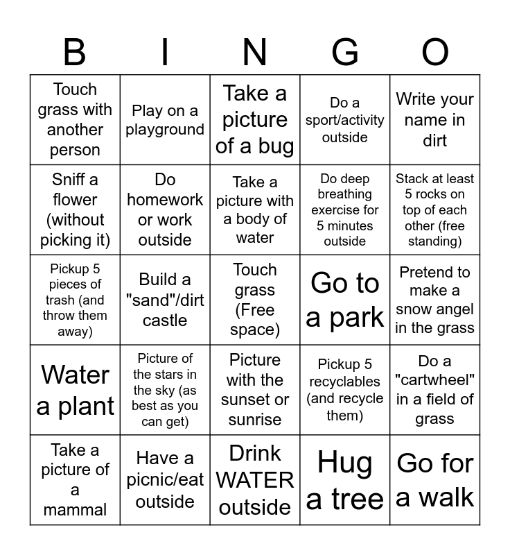 This bingo card has a free space and 25 words: Picture of the stars in the sky (as best as you can get), Drink WATER outside, Take a picture with a body of water, Take a picture of a mammal, Write your name in dirt, Touch grass with another person, Sniff a flower (without picking it), Play on a playground, Go to a park, Picture with the sunset or sunrise, Do deep breathing exercise for 5 minutes outside, Pickup 5 pieces of trash (and throw them away), Pickup 5 recyclables (and recycle them), Do a "cartwheel" in a field of grass, Do homework or work outside, Go on a trail, Pretend to make a snow angel in the grass, Take a picture of a bug, Stack at least 5 rocks on top of each other (free standing), Build a "sand"/dirt castle, Go for a walk, Have a picnic/eat outside, Water a plant, Do a sport/activity outside and Hug a tree.