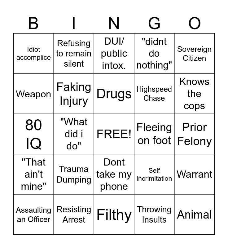 This bingo card has a free space and 24 words: Trauma Dumping, Resisting Arrest, Drugs, Assaulting an Officer, Sovereign Citizen, Idiot accomplice, Weapon, Refusing to remain silent, Fleeing on foot, Dont take my phone, Highspeed Chase, 80 IQ, Self Incrimitation, Warrant, Faking Injury, Throwing Insults, Prior Felony, DUI/ public intox., Knows the cops, "What did i do", Animal, "That ain't mine", "didnt do nothing" and Filthy.