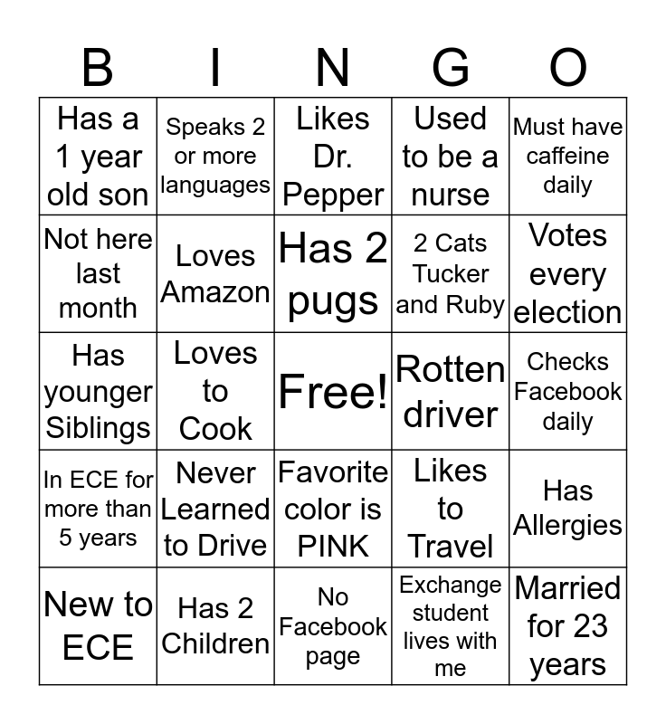 This bingo card has a free space and 24 words: Never Learned to Drive, Has 2 Children, Has 2 pugs, New to ECE, Must have caffeine daily, Has a 1 year old son, Not here last month, Speaks 2 or more languages, Rotten driver, Favorite color is PINK, 2 Cats Tucker and Ruby, Has younger Siblings, Likes to Travel, Has Allergies, Loves Amazon, Exchange student lives with me, Checks Facebook daily, Likes Dr. Pepper, Votes every election, Loves to Cook, Married for 23 years, In ECE for more than 5 years, Used to be a nurse and No Facebook page.
