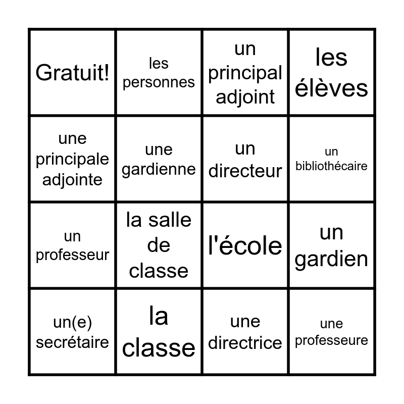This bingo card has 16 words: la classe, un gardien, un principal adjoint, Gratuit!, un professeur, les personnes, l'école, une directrice, une principale adjointe, une gardienne, un(e) secrétaire, les élèves, la salle de classe, un bibliothécaire, un directeur and une professeure.