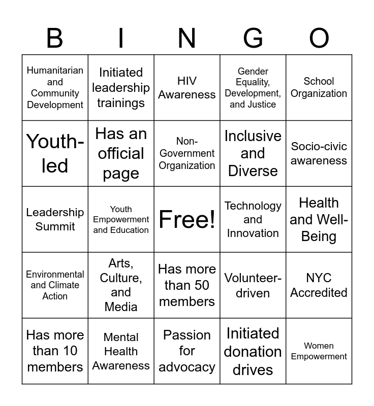 This bingo card has a free space and 39 words: Initiated an environmental project, YORP Registered, Starting Organization, Has an official page, Has more than 10 members, Has more than 50 members, Non-Government Organization, Government Organization, School Organization, Environmental and Climate Action, Youth Empowerment and Education, Gender Equality, Development, and Justice, Women Empowerment, Health and Well-Being, Technology and Innovation, Arts, Culture, and Media, Entrepreneurship and Economic Empowerment, Humanitarian and Community Development, Received an award for local contributions, Volunteer-driven, Youth-led, Passion for advocacy, Inclusive and Diverse, Socio-civic awareness, Collaborated with other organizations, Over 1k social media followers, Sustainability focused, Organized an activity in line with Women's month, Organized an activity in line with Fire Prevention month, Initiated leadership trainings, Clean-up drive, Ten Accomplished Youth Organization Awardee, HIV Awareness, Mental Health Awareness, Initiated donation drives, Community outreach programs, NYC Accredited, Leadership Summit and Youth Development Projects.