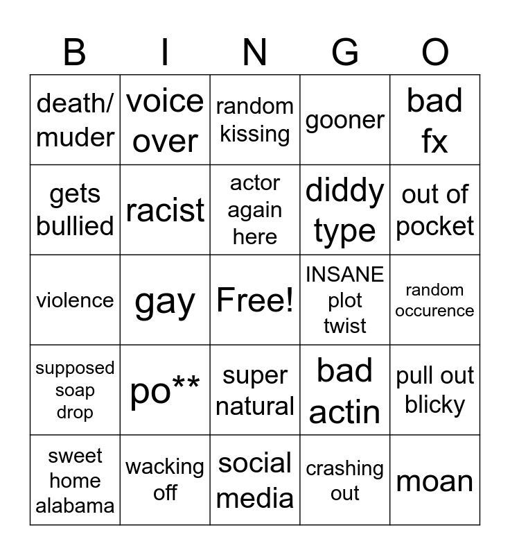 This bingo card has a free space and 24 words: po**, wacking off, actor again here, sweet home alabama, bad fx, death/ muder, gets bullied, voice over, INSANE plot twist, super natural, diddy type, violence, bad actin, pull out blicky, racist, crashing out, random occurence, random kissing, out of pocket, gay, moan, supposed soap drop, gooner and social media.