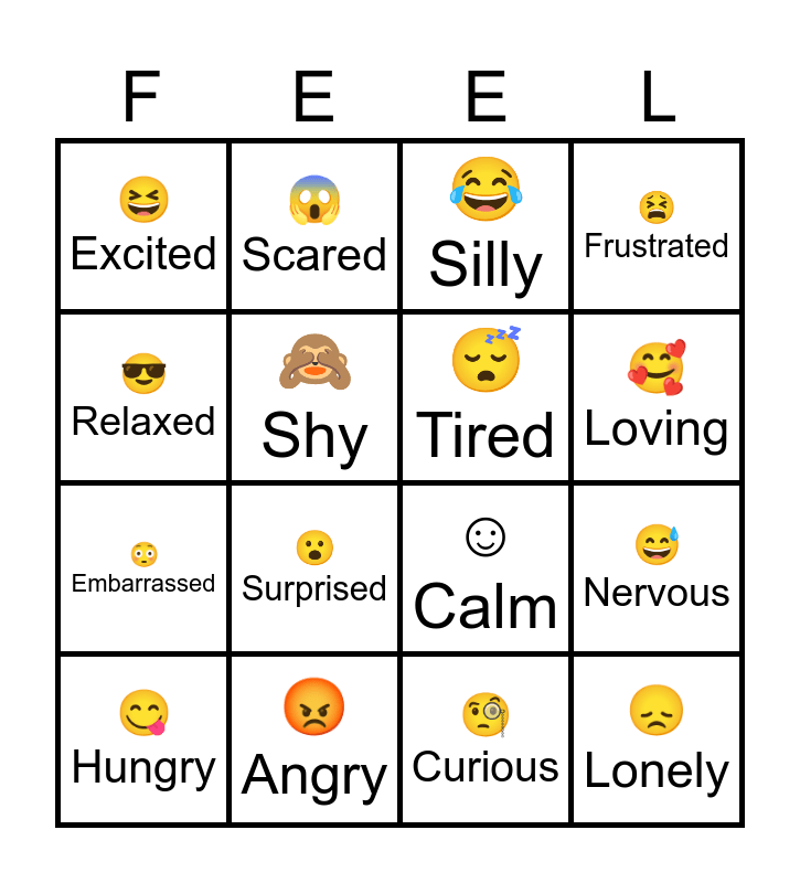 This bingo card has 20 words: 😅Nervous, 😁Happy, 😂 Silly, 🥲 Sad, 😋 Hungry, 😎 Relaxed, 😡 Angry, 😆 Excited, 😳 Embarrassed, 😱 Scared, 😮 Surprised, ☺️ Calm, 🙈 Shy, 😞 Lonely, 😴Tired, 🫤Bored, 🥰Loving, 😫Frustrated, 🧐Curious and 😇Kind.