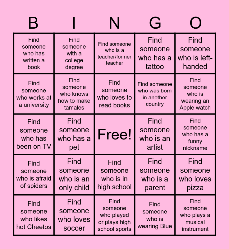 This bingo card has a free space and 24 words: Find someone who is an only child, Find someone who loves soccer, Find someone who loves to read books, Find someone who likes hot Cheetos, Find someone who is left-handed, Find someone who has written a book, Find someone who works at a university, Find someone with a college degree, Find someone who is an artist, Find someone who is in high school, Find someone who was born in another country, Find someone who has been on TV, Find someone who is a parent, Find someone who loves pizza, Find someone who knows how to make tamales, Find someone who is wearing Blue, Find someone who has a funny nickname, Find someone who is a teacher/former teacher, Find someone who is wearing an Apple watch, Find someone who has a pet, Find someone who plays a musical instrument, Find someone who is afraid of spiders, Find someone who has a tattoo and Find someone who played or plays high school sports.