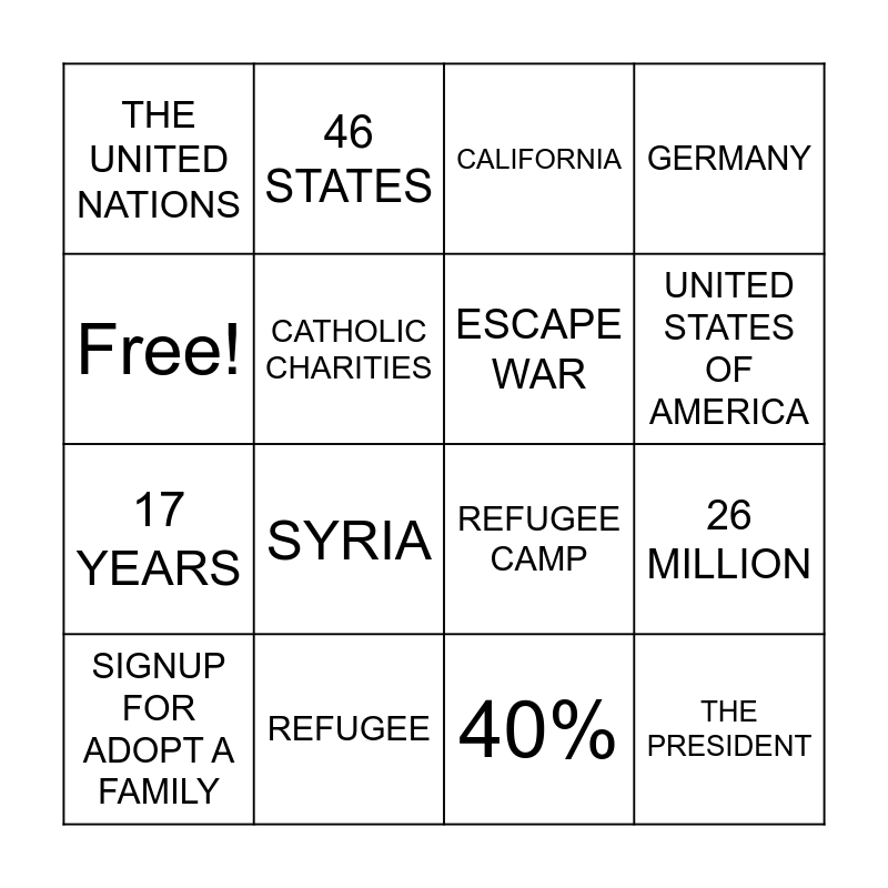 This bingo card has 16 words: REFUGEE, 26 MILLION, CALIFORNIA, THE UNITED NATIONS, 17 YEARS, 46 STATES, REFUGEE CAMP, 40%, Free!, CATHOLIC CHARITIES, SIGNUP FOR ADOPT A FAMILY, GERMANY, SYRIA, UNITED STATES OF AMERICA, ESCAPE WAR and THE PRESIDENT.
