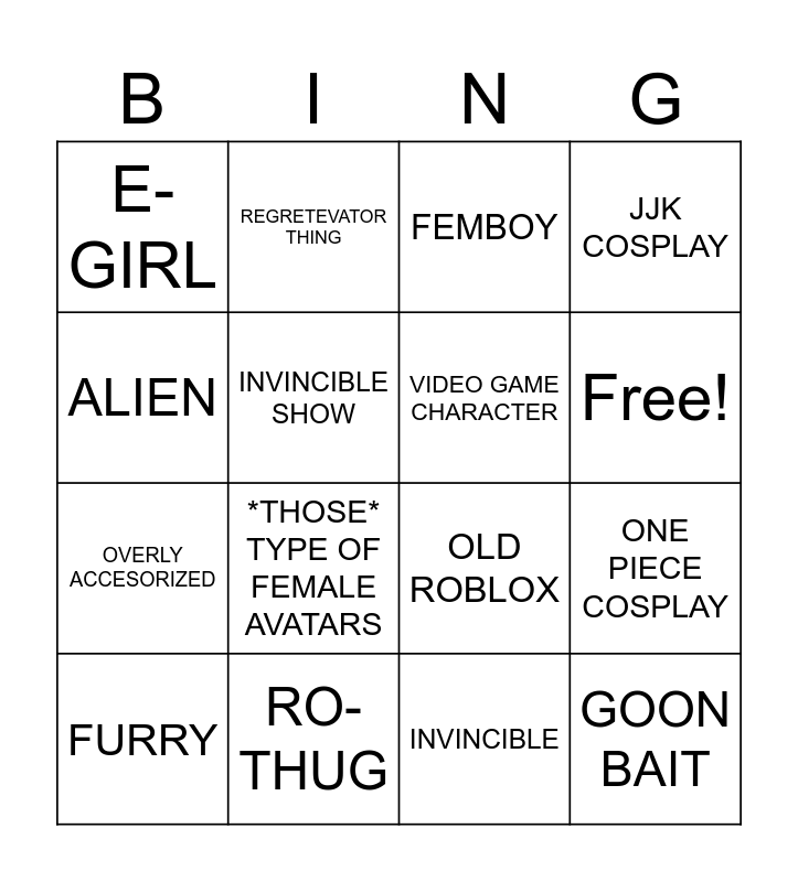 This bingo card has 17 words: INVINCIBLE, FURRY, FEMBOY, E-GIRL, *THOSE* TYPE OF FEMALE AVATARS, JJK COSPLAY, ONE PIECE COSPLAY, VIDEO GAME CHARACTER, Free!, INVINCIBLE SHOW, RO-THUG, OLD ROBLOX, ALIEN, REGRETEVATOR THING, OVERLY ACCESORIZED, OLD ROBLOX AVATAR and GOON BAIT.
