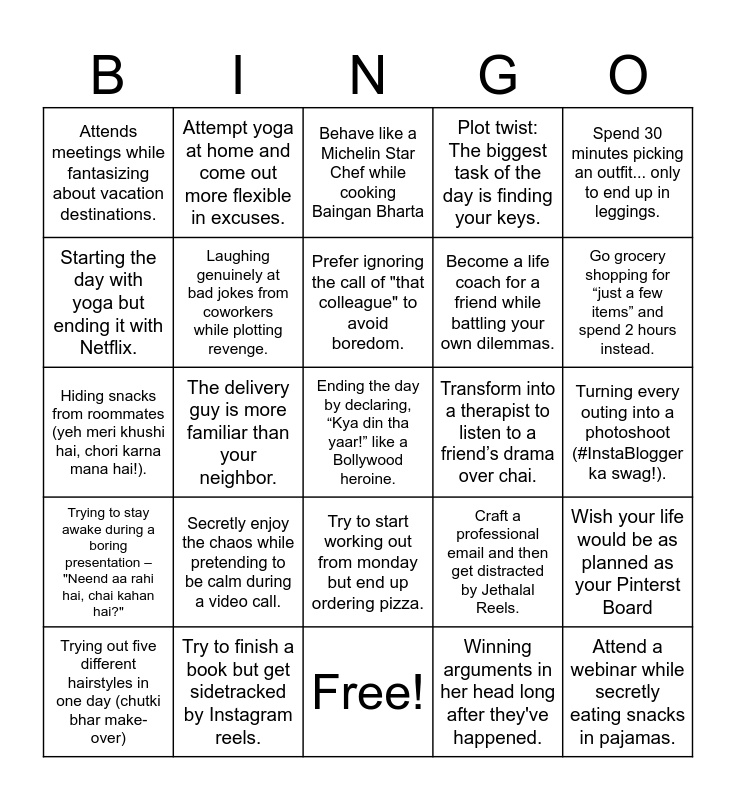 This bingo card has 31 words: Free!, Saying “Just five more minutes” until it becomes an hour., The delivery guy is more familiar than your neighbor., Compiling a list of excuses to avoid small talk (arre wah, koi nahi bola maine!)., Attends meetings while fantasizing about vacation destinations., Behave like a Michelin Star Chef while cooking Baingan Bharta, Laughing genuinely at bad jokes from coworkers while plotting revenge., Craft a professional email and then get distracted by Jethalal Reels., Transform into a therapist to listen to a friend’s drama over chai., Winning arguments in her head long after they've happened., Turning every outing into a photoshoot (#InstaBlogger ka swag!)., Ending the day by declaring, “Kya din tha yaar!” like a Bollywood heroine., Attend a webinar while secretly eating snacks in pajamas., Channel inner "Daya Tappu Ke Papa Gada" during Navratri., Go grocery shopping for “just a few items” and spend 2 hours instead., Overthinking every decision like it’s a top-secret CIA operation., Wish your life would be as planned as your Pinterst Board, Secretly enjoy the chaos while pretending to be calm during a video call., Trying to stay awake during a boring presentation – "Neend aa rahi hai, chai kahan hai?", Try to start working out from monday but end up ordering pizza., Spend 30 minutes picking an outfit... only to end up in leggings., Making chai that could wake the dead., Trying out five different hairstyles in one day (chutki bhar make-over), Attempt yoga at home and come out more flexible in excuses., Become a life coach for a friend while battling your own dilemmas., Starting the day with yoga but ending it with Netflix., Plot twist: The biggest task of the day is finding your keys., Hiding snacks from roommates (yeh meri khushi hai, chori karna mana hai!)., Try to finish a book but get sidetracked by Instagram reels., Prefer ignoring the call of "that colleague" to avoid boredom. and Reciting motivational quotes to friends but rarely taking her own advice..