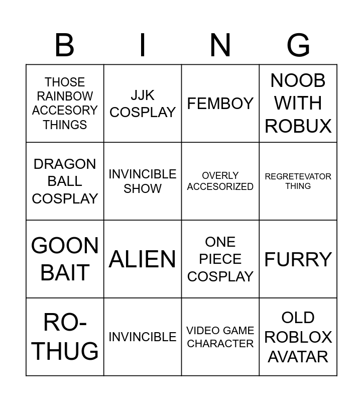This bingo card has 16 words: INVINCIBLE, FURRY, FEMBOY, THOSE RAINBOW ACCESORY THINGS, GOON BAIT, JJK COSPLAY, ONE PIECE COSPLAY, VIDEO GAME CHARACTER, DRAGON BALL COSPLAY, INVINCIBLE SHOW, RO-THUG, NOOB WITH ROBUX, ALIEN, REGRETEVATOR THING, OVERLY ACCESORIZED and OLD ROBLOX AVATAR.
