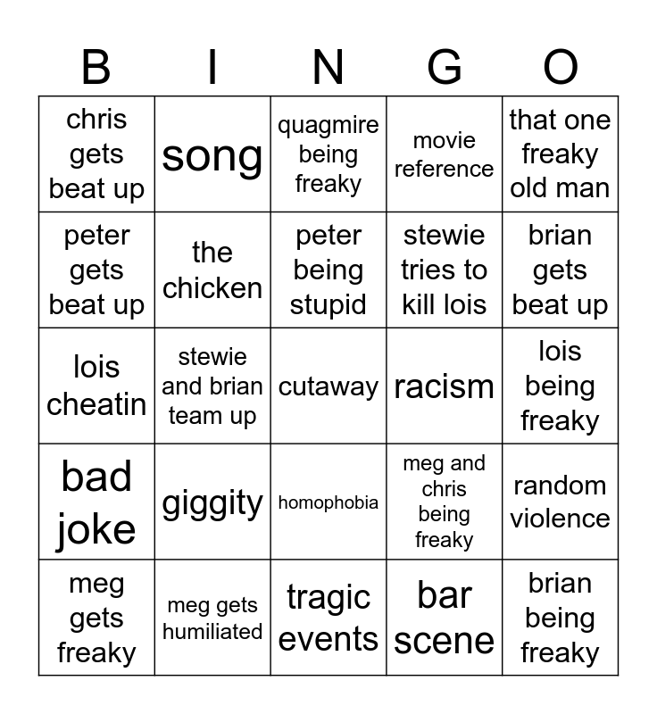 This bingo card has a free space and 24 words: giggity, meg gets humiliated, peter being stupid, meg gets freaky, that one freaky old man, chris gets beat up, peter gets beat up, song, racism, homophobia, stewie tries to kill lois, lois cheatin, meg and chris being freaky, random violence, the chicken, bar scene, lois being freaky, quagmire being freaky, brian gets beat up, stewie and brian team up, brian being freaky, bad joke, movie reference and tragic events.
