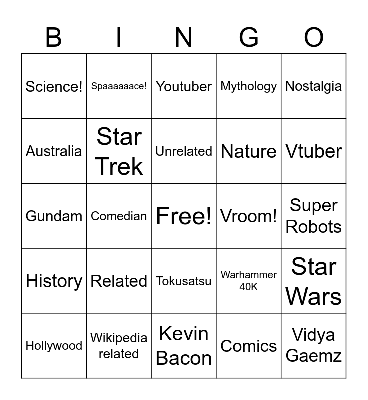 This bingo card has a free space and 24 words: Related, Wikipedia related, Unrelated, Hollywood, Nostalgia, Science!, Australia, Spaaaaaace!, Vroom!, Tokusatsu, Nature, Gundam, Warhammer 40K, Star Wars, Star Trek, Comics, Super Robots, Youtuber, Vtuber, Comedian, Vidya Gaemz, History, Mythology and Kevin Bacon.