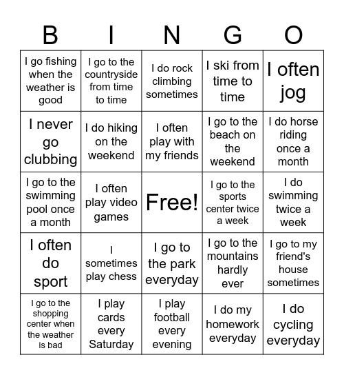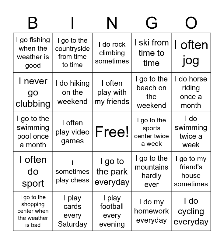 This bingo card has a free space and 24 words: I sometimes play chess, I play cards every Saturday, I often play with my friends, I go to the shopping center when the weather is bad, I often jog, I go fishing when the weather is good, I never go clubbing, I go to the countryside from time to time, I go to the sports center twice a week, I go to the park everyday, I go to the beach on the weekend, I go to the swimming pool once a month, I go to the mountains hardly ever, I go to my friend's house sometimes, I do hiking on the weekend, I do my homework everyday, I do swimming twice a week, I do rock climbing sometimes, I do horse riding once a month, I often play video games, I do cycling everyday, I often do sport, I ski from time to time and I play football every evening.