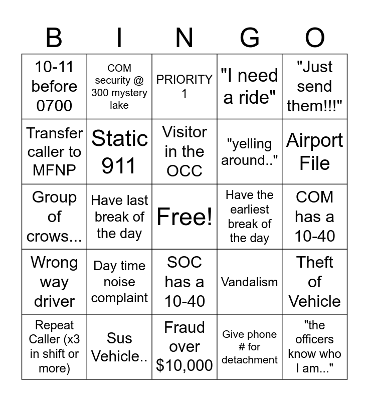 This bingo card has a free space and 24 words: Day time noise complaint, Sus Vehicle.., Visitor in the OCC, Repeat Caller (x3 in shift or more), "Just send them!!!", 10-11 before 0700, Transfer caller to MFNP, COM security @ 300 mystery lake, Have the earliest break of the day, SOC has a 10-40, "yelling around..", Group of crows..., Vandalism, Theft of Vehicle, Static 911, Give phone # for detachment, COM has a 10-40, PRIORITY 1, Airport File, Have last break of the day, "the officers know who I am...", Wrong way driver, "I need a ride" and Fraud over $10,000.