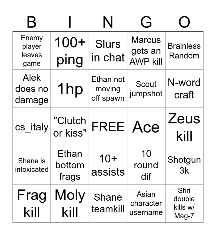 This bingo card has a free space and 44 words: Cody downloads replay, Shri double kills w/ Mag-7, 3+ AWPs, Frag kill, Eco round win, Asian character username, Slurs in chat, Alek his a nasty one deag, Brainless Random, Moly kill, Marcus gets an AWP kill, Ace, 10+ assists, Ethan bottom frags, Foreign language, Shane teamkill, Aiden says "I got mine", cs_italy, Squeaker, N-word craft, 100+ ping, Knife kill, Random blames team, Enemy player leaves game, 1000+ $ knife, Zeus kill, Random doesn't buy armor, Jacob in party, 10 round dif, Shane is intoxicated, Dylan ruins kill, Shotgun 3k, Xv1 clutch, random chokes, "Clutch or kiss", Enemy says "defuse if gay", Enemy says "afk", Cody doesn't have headphones on, Ethan not moving off spawn, Alek does no damage, Scout jumpshot, >1 second defuse, 1hp and Someone falls off the map.