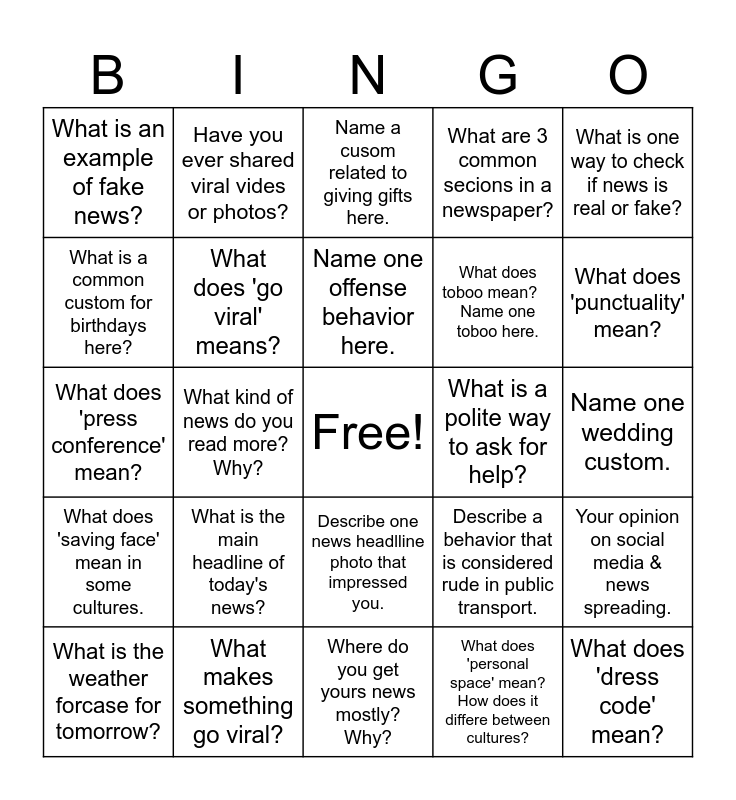 This bingo card has a free space and 25 words: What is the main headline of today's news?, Where do you get yours news mostly? Why?, Name one offense behavior here., What is the weather forcase for tomorrow?, What is one way to check if news is real or fake?, What is an example of fake news?, What is a common custom for birthdays here?, Have you ever shared viral vides or photos?, What is a polite way to ask for help?, Describe one news headlline photo that impressed you., What does toboo mean? Name one toboo here., What does 'press conference' mean?, Describe a behavior that is considered rude in public transport., Your opinion on social media & news spreading., What does 'go viral' means?, What is an example of viral video?, Name one wedding custom., Name a cusom related to giving gifts here., What does 'punctuality' mean?, What kind of news do you read more? Why?, What does 'dress code' mean?, What makes something go viral?, What does 'saving face' mean in some cultures., What are 3 common secions in a newspaper? and What does 'personal space' mean? How does it differe between cultures?.