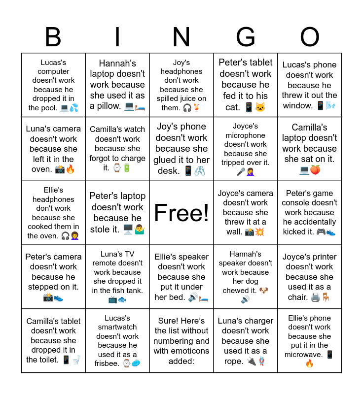 This bingo card has a free space and 31 words: Sure! Hereโs the list without numbering and with emoticons added:, Luna's phone doesn't work because she ate it. ๐ด๐ฑ, Peter's laptop doesn't work because he stole it. ๐ฅ๏ธ๐คทโโ๏ธ, Ellie's tablet doesn't work because she smashed it. ๐ฅ๐ฑ, Lucas's computer doesn't work because he dropped it in the pool. ๐ป๐ฆ, Joy's headphones don't work because she spilled juice on them. ๐ง๐น, Camilla's watch doesn't work because she forgot to charge it. โ๐, Hannah's speaker doesn't work because her dog chewed it. ๐ถ๐, Joyce's camera doesn't work because she threw it at a wall. ๐ธ๐ฅ, Luna's charger doesn't work because she used it as a rope. ๐๐ชข, Peter's game console doesn't work because he accidentally kicked it. ๐ฎ๐, Ellie's phone doesn't work because she put it in the microwave. ๐ฑ๐ฅ, Lucas's keyboard doesn't work because he spilled cereal on it. โจ๏ธ๐ฅฃ, Joy's smartwatch doesn't work because she left it in the rain. โ๐ง๏ธ, Camilla's laptop doesn't work because she sat on it. ๐ป๐, Hannah's tablet doesn't work because she put it in the freezer. ๐ฑโ๏ธ, Joyce's printer doesn't work because she used it as a chair. ๐จ๏ธ๐ช, Luna's TV remote doesn't work because she dropped it in the fish tank. ๐บ๐, Peter's camera doesn't work because he stepped on it. ๐ธ๐, Ellie's speaker doesn't work because she put it under her bed. ๐๐๏ธ, Lucas's phone doesn't work because he threw it out the window. ๐ฑ๐ฌ๏ธ, Joy's gaming headset doesn't work because she spilled soup on it. ๐ง๐ฒ, Camilla's tablet doesn't work because she dropped it in the toilet. ๐ฑ๐ฝ, Hannah's laptop doesn't work because she used it as a pillow. ๐ป๐๏ธ, Joyce's microphone doesn't work because she tripped over it. ๐ค๐คฆโโ๏ธ, Luna's camera doesn't work because she left it in the oven. ๐ธ๐ฅ, Peter's tablet doesn't work because he fed it to his cat. ๐ฑ๐ฑ, Ellie's headphones don't work because she cooked them in the oven. ๐ง๐ฉโ๐ฆฑ, Lucas's smartwatch doesn't work because he used it as a frisbee. โ๐ฅ, Joy's phone doesn't work because she glued it to her desk. ๐ฑ๐๏ธ and Camilla's speaker doesn't work because she kicked it down the stairs. ๐โฌ๏ธ.