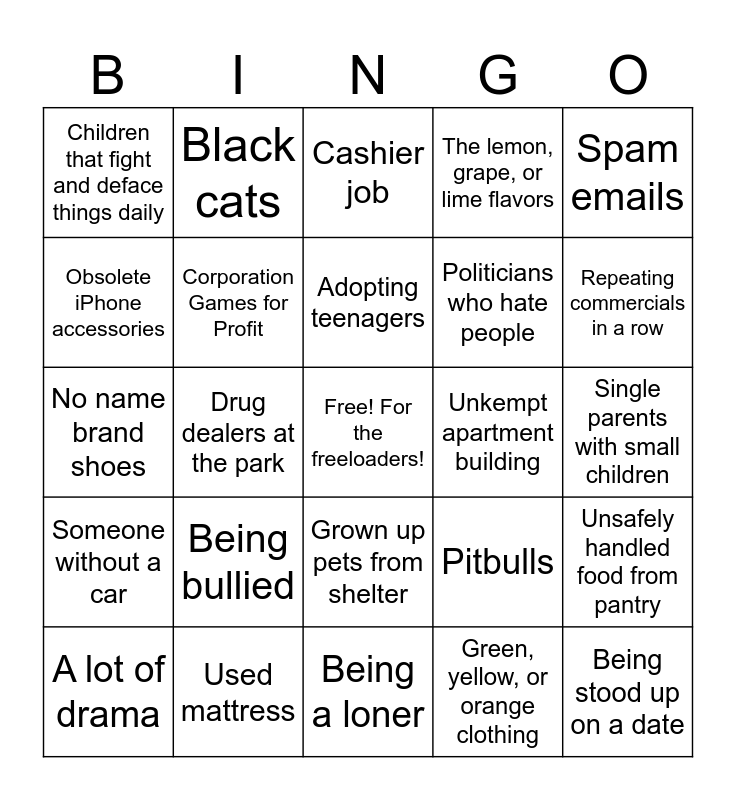 This bingo card has a free space and 24 words: Being bullied, Used mattress, Adopting teenagers, A lot of drama, Spam emails, Children that fight and deface things daily, Obsolete iPhone accessories, Black cats, Unkempt apartment building, Grown up pets from shelter, Politicians who hate people, No name brand shoes, Pitbulls, Unsafely handled food from pantry, Corporation Games for Profit, Green, yellow, or orange clothing, Single parents with small children, Cashier job, Repeating commercials in a row, Drug dealers at the park, Being stood up on a date, Someone without a car, The lemon, grape, or lime flavors and Being a loner.