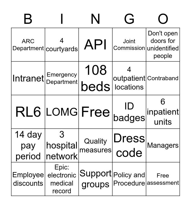 This bingo card has a free space and 24 words: 3 hospital network, Epic: electronic medical record, 108 beds, Employee discounts, Don't open doors for unidentified people, ARC Department, Intranet, 4 courtyards, ID badges, Quality measures, 4 outpatient locations, RL6, Dress code, Managers, Emergency Department, Policy and Procedure, 6 inpatient units, API, Contraband, LOMG, Free assessment, 14 day pay period, Joint Commission and Support groups.
