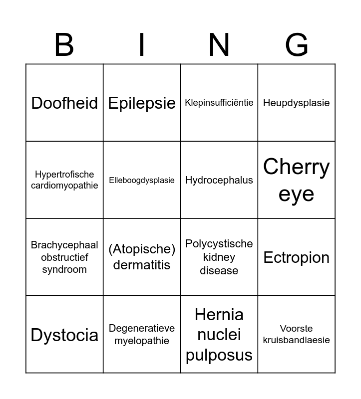 This bingo card has 26 words: Dilatative cardiomyopathie, Sharpei fever, Cherry eye, Chiara-like Malformatie / Syringomyelie, Hypertrofische cardiomyopathie, Doofheid, Elleboogdysplasie, Epilepsie, Hernia nuclei pulposus, Malassezie dermatitis, Brachycephaal obstructief syndroom, Polycystische kidney disease, MDR1-gen mutatie, Dermoid sinus, Ectropion, Patella luxatie, Heupdysplasie, Voorste kruisbandlaesie, Klepinsufficiëntie, Dystocia, (Atopische) dermatitis, Entropion, Degeneratieve myelopathie, Osteochondrodysplasie, Hydrocephalus and Radius curvus syndroom.