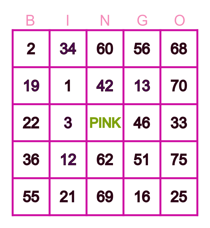 This bingo card has a free space and 24 words: 12, 21, 42, 55, 68, 2, 19, 34, 46, 62, 13, 22, 51, 75, 1, 16, 33, 60, 70, 3, 25, 36, 56 and 69.