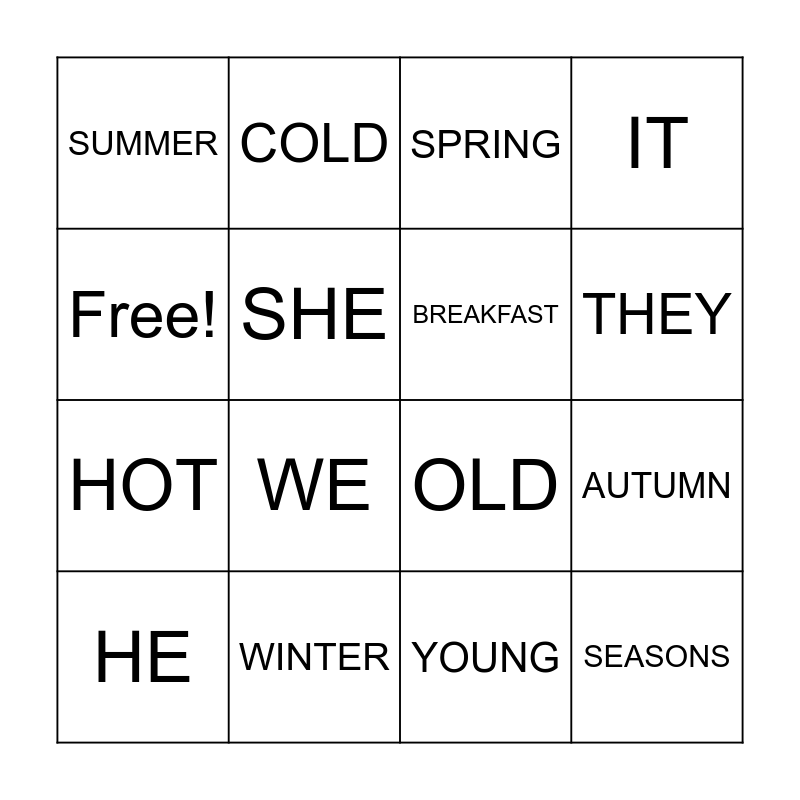 This bingo card has 16 words: WINTER, AUTUMN, SPRING, SUMMER, HOT, COLD, OLD, YOUNG, Free!, SHE, HE, IT, WE, THEY, BREAKFAST and SEASONS.