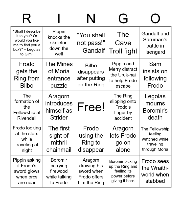 This bingo card has a free space and 75 words: "A wizard is never late, nor is he early. He arrives precisely when he means to." – Gandalf, "One does not simply walk into Mordor." – Boromir, "You shall not pass!" – Gandalf, "Fly, you fools!" – Gandalf, "I wish the Ring had never come to me." – Frodo, "Even the smallest person can change the course of the future." – Galadriel, "It comes in pints?" – Pippin, "Looks like meat's back on the menu, boys!" – Uruk-hai, The Ring falls onto Frodo's finger at the Prancing Pony, "Is it secret? Is it safe?" – Frodo & Gandalf, The Shire introduction, Gandalf sets off fireworks at Bilbo's party, Bilbo disappears after putting on the Ring, Frodo gets the Ring from Bilbo, The hobbits encountering elves in the woods at night, Aragorn introduces himself as Strider, The hobbits hide under the tree roots from a Ringwraith, Frodo sees the Wraith-world when stabbed, Arwen rides with Frodo to Rivendell, Gandalf and Saruman’s battle in Isengard, Elrond recounts Isildur failing to destroy the Ring, The formation of the Fellowship at Rivendell, The Mines of Moria entrance puzzle, Pippin knocks the skeleton down the well, The Cave Troll fight, Frodo narrowly dodging an orc blade in Moria, The Balrog appears, Gandalf falls in Moria, The Fellowship grieving Gandalf’s fall in Moria, Sam seeing the Oliphaunts in Galadriel’s mirror, Galadriel gives Frodo the Light of Eärendil, The boats down the Great River, The Argonath statues, Aragorn lets Frodo go on alone, Sam insists on following Frodo, Pippin and Merry distract the Uruk-hai to help Frodo escape, Boromir's death, Merry and Pippin charge at the Uruk-hai to protect Frodo, Legolas mourns Boromir's death, Boromir picking up the Ring and feeling its power before giving it back, Sam nearly drowns trying to follow Frodo, "That is no mere ranger. That is Aragorn, son of Arathorn!" – Legolas dramatically stating the obvious, Boromir teaching Merry and Pippin how to fight, "Mushrooms!" – Merry and Pippin stealing Farmer Maggot’s mushrooms, Legolas’ "amazing" ability to walk on snow while everyone else struggles, Gimli wanting to be tossed across the gap in Moria, Pippin asking if Frodo’s sword glows when orcs are near, "Shall I describe it to you? Or would you like me to find you a box?" – Legolas to Gimli, Frodo being stabbed, Aragorn finding Boromir wounded but still alive, Frodo being handed the task of destroying the Ring by Gandalf, Frodo using the Ring to disappear, Legolas taking down an orc with a crazy arrow shot, Aragorn and Boromir fighting side by side against the Uruk-hai, Gimli smashing orcs with his axe, Aragorn beheading an Uruk-hai, The Horn of Gondor being blown by Boromir, Legolas taking out multiple orcs in rapid succession, Gandalf whispering to the moth while trapped at the top of Orthanc, Arwen summoning the river to stop the Nazgûl, The first sight of mithril chainmail, Saruman creating Uruk-hai in Isengard, Gandalf trapped at the top of Orthanc, Gollum is heard muttering "precious" in the Mines of Moria, The Eye of Sauron appearing when Frodo puts on the Ring, The Ring slipping onto Frodo’s finger by accident, Bilbo's "evil" face, The Ring’s weight causing Frodo visible distress, The Ring whispering to Frodo, The Fellowship feeling watched while traveling through Moria, Frodo looking at the stars while traveling at night, Boromir carrying firewood while talking to Frodo, Any mention or sight of potatoes, Aragorn drawing his sword when Frodo offers him the Ring and The Fellowship preparing their boats before heading downriver.