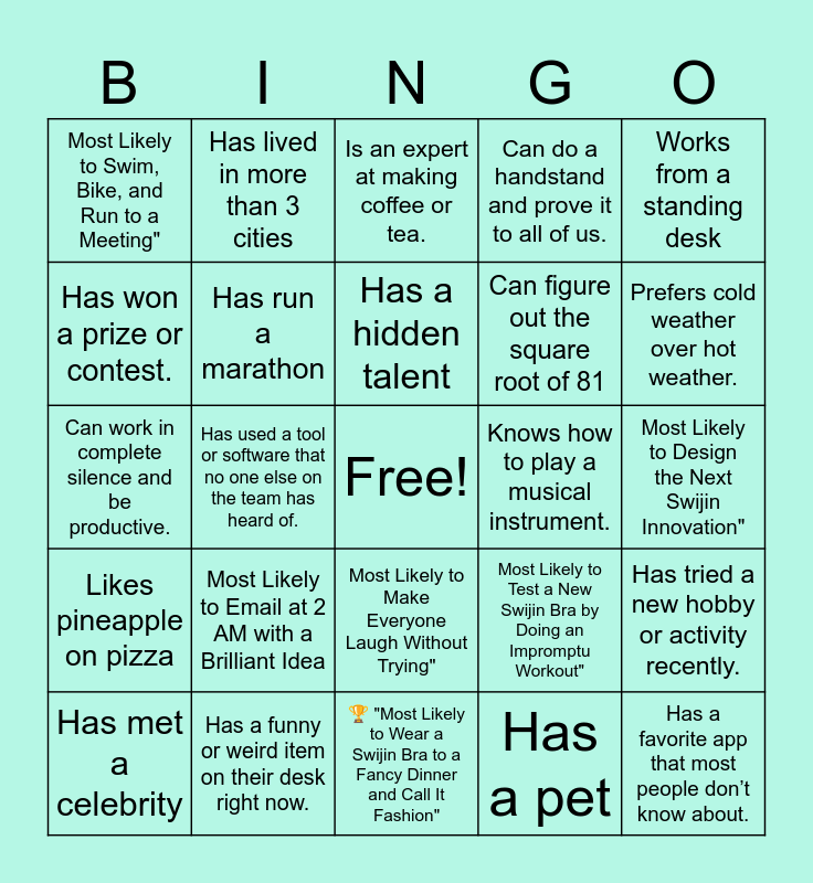 This bingo card has a free space and 34 words: Is a parent, Has a pet, Has traveled to more than 5 countries, Speaks more than one language, Likes pineapple on pizza, Has run a marathon, Works from a standing desk, Has met a celebrity, Has lived in more than 3 cities, Loves to sing in the shower, Has a hidden talent, Is an expert at making coffee or tea., Has met someone famous., Is a "morning person" who loves starting their day early., Knows how to play a musical instrument., Prefers cold weather over hot weather., Has a funny or weird item on their desk right now., Can work in complete silence and be productive., Most Likely to Email at 2 AM with a Brilliant Idea, Most Likely to Test a New Swijin Bra by Doing an Impromptu Workout", Most Likely to Make Everyone Laugh Without Trying", π "Most Likely to Have the Best Zoom Background (Right Now!)", Most Likely to Swim, Bike, and Run to a Meeting", Most Likely to Design the Next Swijin Innovation", π "Most Likely to Wear a Swijin Bra to a Fancy Dinner and Call It Fashion", Has a favorite app that most people donβt know about., Can do a handstand and prove it to all of us., Has a Specialized product, Can figure out the square root of 81, Has won a prize or contest., Follows a podcast regularly., Has used a tool or software that no one else on the team has heard of., Has tried a new hobby or activity recently. and Is completely nuts about ___.