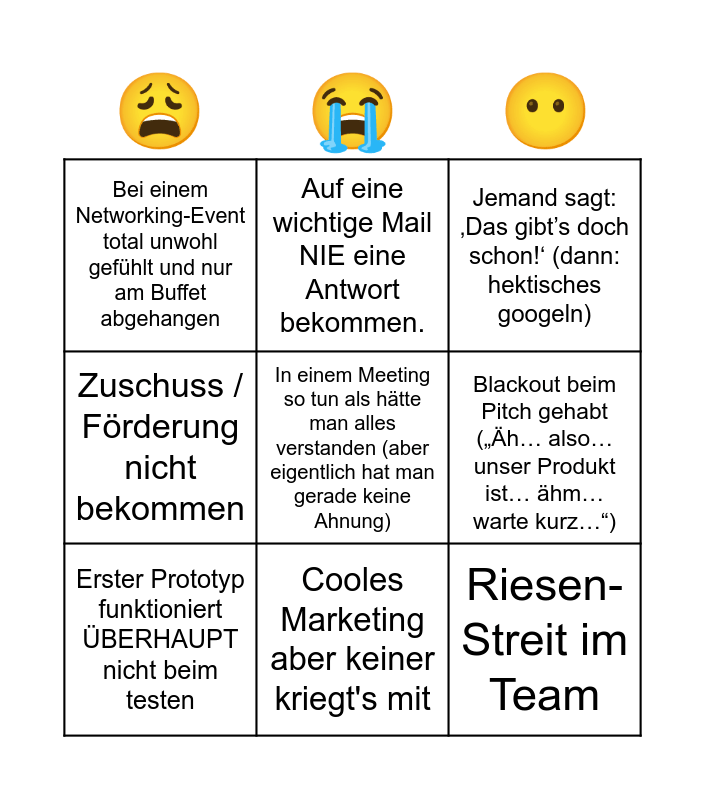 This bingo card has a free space and 8 words: Blackout beim Pitch gehabt („Äh… also… unser Produkt ist… ähm… warte kurz…“), Jemand sagt: ‚Das gibt’s doch schon!‘ (dann: hektisches googeln), Auf eine wichtige Mail NIE eine Antwort bekommen., Erster Prototyp funktioniert ÜBERHAUPT nicht beim testen, Bei einem Networking-Event total unwohl gefühlt und nur am Buffet abgehangen, Riesen-Streit im Team, Zuschuss / Förderung nicht bekommen and Cooles Marketing aber keiner kriegt's mit.