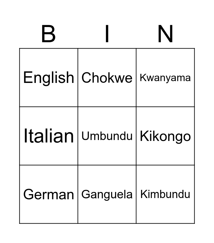 This bingo card has 12 words: Free!, Kimbundu, Umbundu, Kikongo, Chokwe, Kwanyama, Ganguela, Argentine Spanish, English, Italian, German and French.