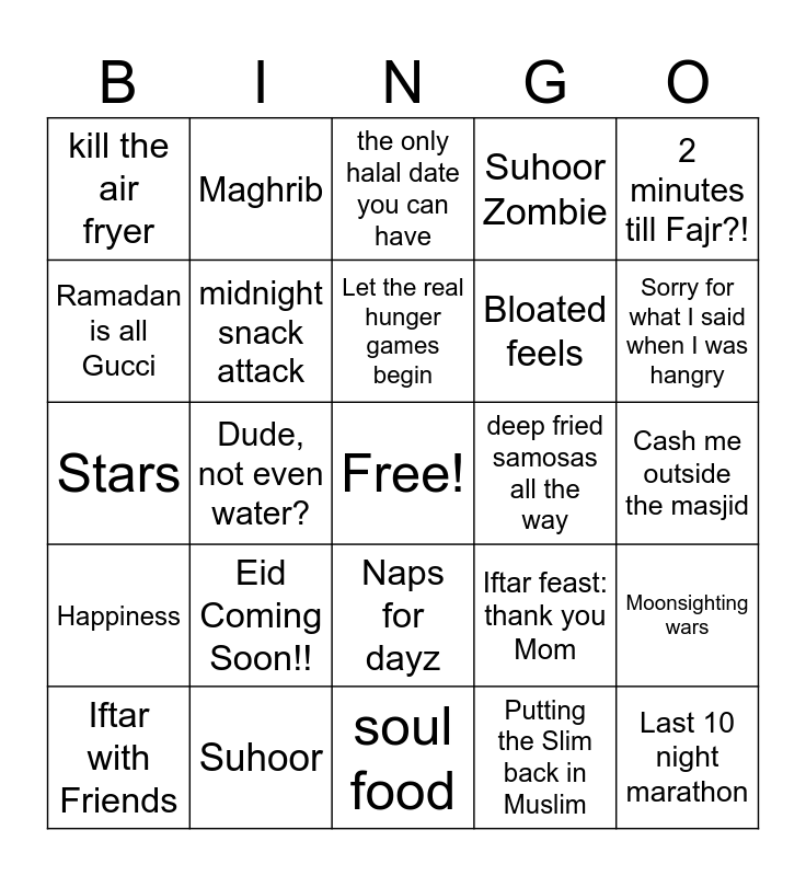 This bingo card has a free space and 24 words: Eid Coming Soon!!, Suhoor, Let the real hunger games begin, Iftar with Friends, 2 minutes till Fajr?!, kill the air fryer, Ramadan is all Gucci, Maghrib, deep fried samosas all the way, Naps for dayz, Bloated feels, Stars, Iftar feast: thank you Mom, Moonsighting wars, midnight snack attack, Putting the Slim back in Muslim, Cash me outside the masjid, the only halal date you can have, Sorry for what I said when I was hangry, Dude, not even water?, Last 10 night marathon, Happiness, Suhoor Zombie and soul food.