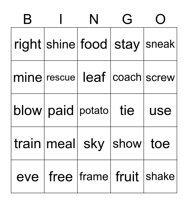 This bingo card has a free space and 24 words: meal, free, leaf, eve, sneak, right, mine, shine, tie, sky, coach, blow, show, toe, rescue, fruit, use, food, screw, paid, shake, train, stay and frame.