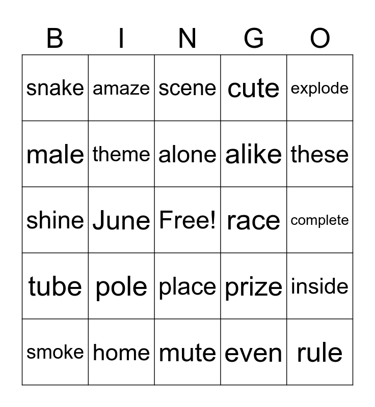 This bingo card has a free space and 24 words: pole, home, alone, smoke, explode, snake, male, amaze, race, place, alike, shine, prize, inside, theme, even, complete, scene, these, June, rule, tube, cute and mute.