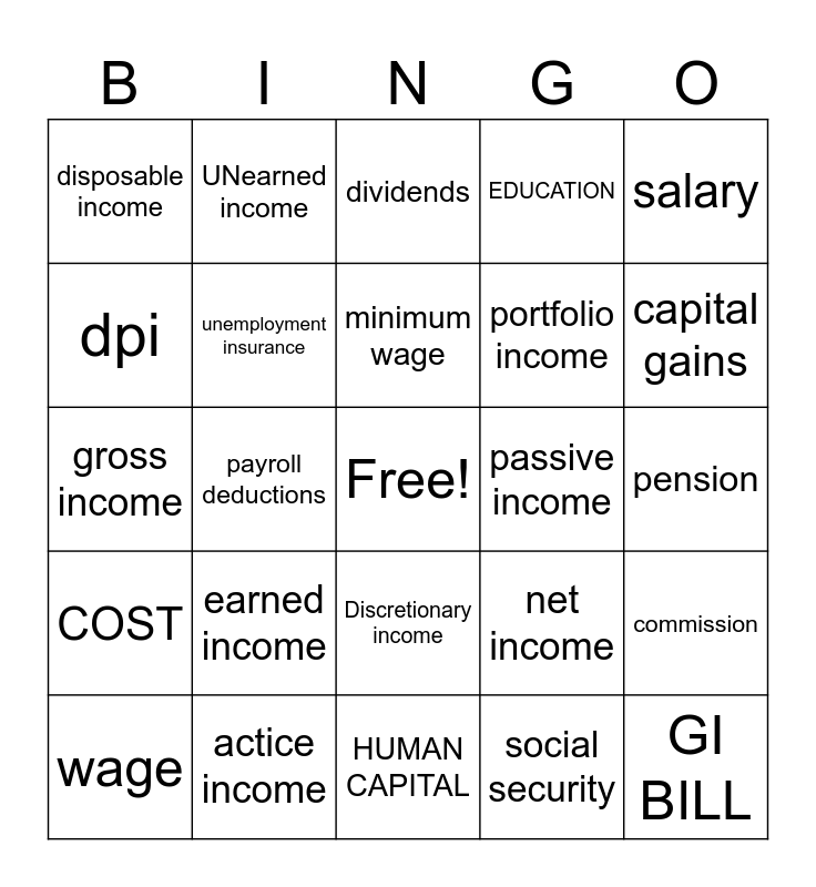 This bingo card has a free space and 24 words: earned income, actice income, minimum wage, wage, salary, disposable income, dpi, UNearned income, passive income, Discretionary income, portfolio income, gross income, net income, commission, unemployment insurance, social security, pension, dividends, capital gains, payroll deductions, GI BILL, COST, EDUCATION and HUMAN CAPITAL.
