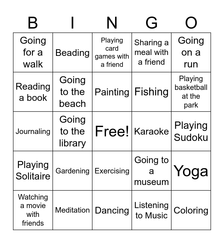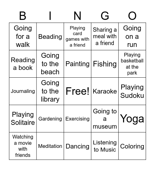 This bingo card has a free space and 24 words: Gardening, Meditation, Painting, Watching a movie with friends, Going on a run, Going for a walk, Reading a book, Beading, Karaoke, Exercising, Fishing, Journaling, Going to a museum, Yoga, Going to the beach, Listening to Music, Playing Sudoku, Playing card games with a friend, Playing basketball at the park, Going to the library, Coloring, Playing Solitaire, Sharing a meal with a friend and Dancing.
