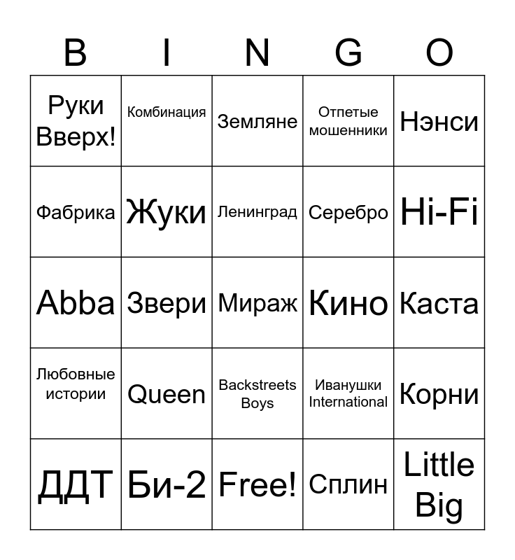 This bingo card has 25 words: Любовные истории, Би-2, Мираж, Сплин, Нэнси, Руки Вверх!, Комбинация, Земляне, Кино, Корни, Фабрика, Жуки, Free!, Иванушки International, Hi-Fi, ДДТ, Звери, Ленинград, Серебро, Каста, Abba, Queen, Backstreets Boys, Отпетые мошенники and Little Big.