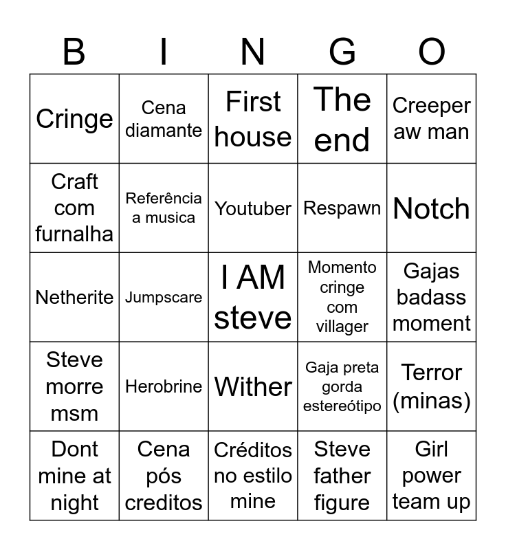 This bingo card has a free space and 24 words: Herobrine, Cena pós creditos, Youtuber, Dont mine at night, Creeper aw man, Cringe, Craft com furnalha, Cena diamante, Momento cringe com villager, Wither, Respawn, Netherite, Gaja preta gorda estereótipo, Terror (minas), Referência a musica, Steve father figure, Gajas badass moment, First house, Notch, Jumpscare, Girl power team up, Steve morre msm, The end and Créditos no estilo mine.