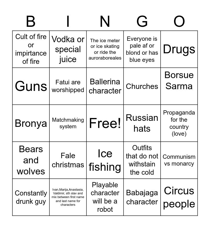 This bingo card has a free space and 24 words: Fale christmas, Ivan,Marija,Anastasia, Valdimir, sth slav and mix between first name and last name for characters, Ballerina character, Constantly drunk guy, Drugs, Cult of fire or impirtance of fire, Guns, Vodka or special juice, Russian hats, Ice fishing, Churches, Bronya, Outfits that do not withstain the cold, Communism vs monarcy, Fatui are worshipped, Babajaga character, Propaganda for the country (love), The ice meter or ice skating or ride the auroraboreales, Borsue Sarma, Matchmaking system, Circus people, Bears and wolves, Everyone is pale af or blond or has blue eyes and Playable character will be a robot.