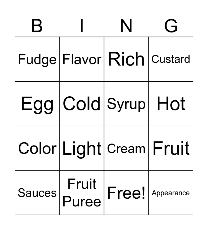 This bingo card has 17 words: Free!, Sauces, Rich, Fudge, Light, Custard, Fruit, Syrup, Hot, Cold, Fruit Puree, Cream, Egg, Flavor, Color, Moisture and Appearance.