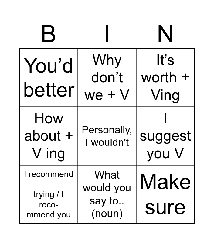 This bingo card has a free space and 9 words: I recommend trying / I reco- mmend you, It’s worth + Ving, Why don’t we + V, How about + V ing, You’d better, I suggest you V, Make sure, I don't feel like V + ing and What would you say to.. (noun).