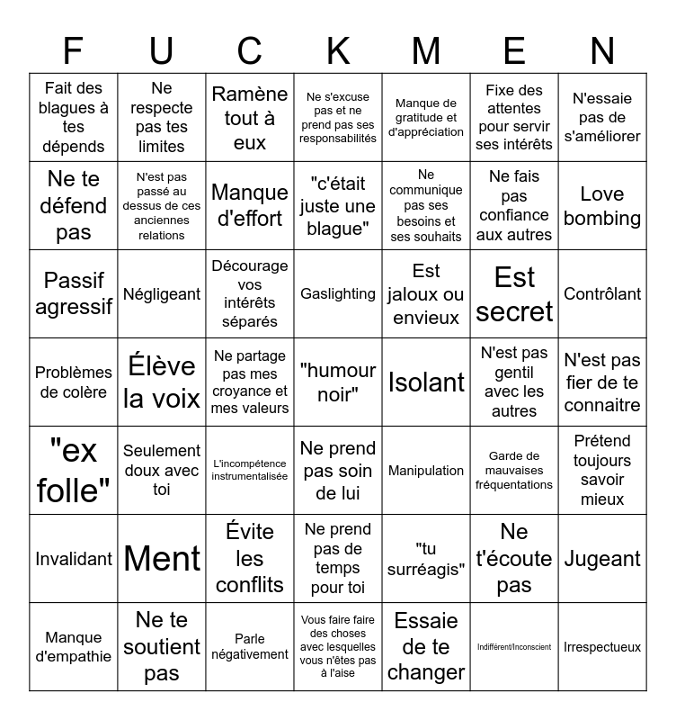 This bingo card has 49 words: Ne t'écoute pas, Ne fais pas confiance aux autres, Essaie de te changer, Élève la voix, Décourage vos intérêts séparés, N'est pas fier de te connaitre, Ne respecte pas tes limites, Parle négativement, Fixe des attentes pour servir ses intérêts, Ne prend pas soin de lui, N'essaie pas de s'améliorer, Ne s'excuse pas et ne prend pas ses responsabilités, Est secret, Est jaloux ou envieux, Ment, N'est pas gentil avec les autres, Ne te défend pas, Love bombing, Jugeant, Manque de gratitude et d'appréciation, Ne communique pas ses besoins et ses souhaits, Ne partage pas mes croyance et mes valeurs, Fait des blagues à tes dépends, N'est pas passé au dessus de ces anciennes relations, Manque d'empathie, Manque d'effort, Contrôlant, Ne te soutient pas, Gaslighting, Négligeant, Irrespectueux, Isolant, Invalidant, Évite les conflits, Problèmes de colère, Manipulation, Garde de mauvaises fréquentations, Prétend toujours savoir mieux, Passif agressif, L'incompétence instrumentalisée, Ne prend pas de temps pour toi, "ex folle", "humour noir", Vous faire faire des choses avec lesquelles vous n'êtes pas à l'aise, "c'était juste une blague", Ramène tout à eux, "tu surréagis", Seulement doux avec toi and Indifférent/Inconscient.