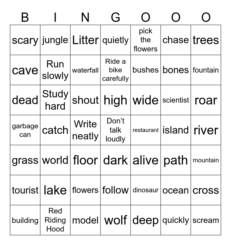 This bingo card has 49 words: ocean, bones, deep, catch, shout, river, jungle, model, chase, dark, trees, quietly, scientist, wide, lake, island, cave, fountain, cross, pick the flowers, bushes, Write neatly, scary, Run slowly, building, waterfall, roar, Red Riding Hood, high, Study hard, scream, restaurant, tourist, flowers, garbage can, alive, path, mountain, dead, floor, follow, grass, Donβt talk loudly, wolf, Ride a bike carefully, Litter, dinosaur, world and quickly.