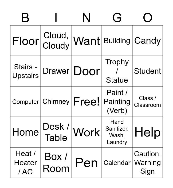 This bingo card has a free space and 81 words: Ask, Need, Want, School, High School, Flag, Tape, Drink, Question, Alarm, Bell, Backpack, Building, Floor, Wall, Stairs - Upstairs, Stairs - Downstairs, Desk / Table, Cabinet / Large Container, Class / Classroom, Chair / Sit, Candy, Computer, Door, Drawer, Electrical Outlet / Charger, Garbage / Trash, Phone, Hall / Street, Teacher, Student, Locker, Pen, Pencil, Heat / Heater / AC, Paint / Painting (Verb), Picture, Painting (Noun), Color, Sign, Signing (ASL), Sign, Poster, Caution, Warning Sign, Window, Elevator, Fire, Burning, Chimney, Door, Cloud, Cloudy, Leaf, Plane, Wire / Cord, Hand Sanitizer, Wash, Laundry, Help, Watch, Printer, Book, Principal, Learn, Know, Staple / Stapler, Do, Work, Homework, Assign / Assignment, Food / Eat, Machine, News / Newspaper, Rain / Rainy, Snow / Snowy, Sun / Sunny, Shelf, Board, Home, Box / Room, Couch, Headphones, Light, Mask, Calendar, Paper, Trophy / Statue and Stand / Podium.