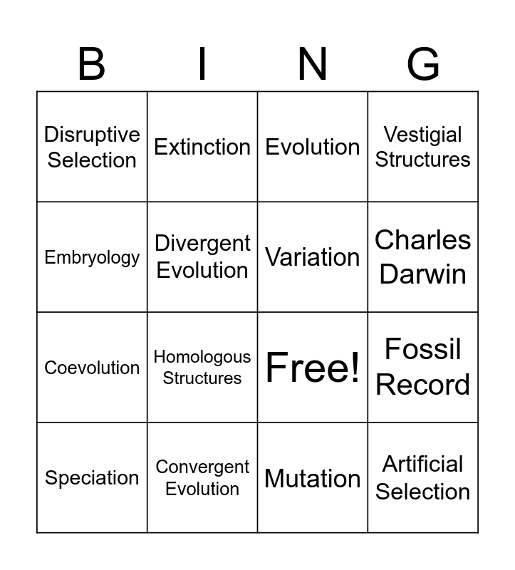 This bingo card has 22 words: Convergent Evolution, Fitness, Extinction, Natural Selection, Divergent Evolution, Variation, Disruptive Selection, Evolution, Free!, Artificial Selection, Coevolution, Vestigial Structures, Stabilizing Selection, Directional Selection, Mutation, Species, Fossil Record, Speciation, Homologous Structures, Embryology, Charles Darwin and Comparative Anatomy.