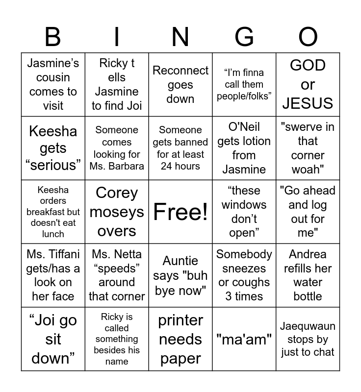 This bingo card has a free space and 24 words: Ms. Netta “speeds” around that corner, Ricky is called something besides his name, Someone gets banned for at least 24 hours, “Joi go sit down”, GOD or JESUS, Jasmine’s cousin comes to visit, Keesha gets “serious”, Ricky tells Jasmine to find Joi, “these windows don’t open”, Auntie says "buh bye now", O'Neil gets lotion from Jasmine, Keesha orders breakfast but doesn't eat lunch, Somebody sneezes or coughs 3 times, Andrea refills her water bottle, Someone comes looking for Ms. Barbara, "ma'am", "Go ahead and log out for me", Reconnect goes down, "swerve in that corner woah", Corey moseys overs, Jaequwaun stops by just to chat, Ms. Tiffani gets/has a look on her face, “I’m finna call them people/folks” and printer needs paper.