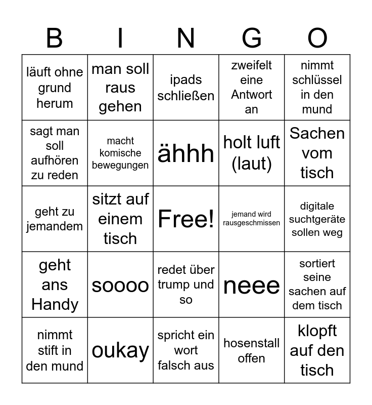 This bingo card has a free space and 24 words: soooo, oukay, ähhh, nimmt stift in den mund, nimmt schlüssel in den mund, läuft ohne grund herum, sagt man soll aufhören zu reden, man soll raus gehen, jemand wird rausgeschmissen, redet über trump und so, holt luft (laut), geht zu jemandem, neee, sortiert seine sachen auf dem tisch, macht komische bewegungen, hosenstall offen, digitale suchtgeräte sollen weg, ipads schließen, Sachen vom tisch, sitzt auf einem tisch, klopft auf den tisch, geht ans Handy, zweifelt eine Antwort an and spricht ein wort falsch aus.