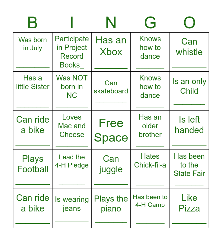 This bingo card has a free space and 32 words: Has been to DAD or VLA Conference _______, Is wearing jeans ________, Plays the piano _______, Has a Dog _______, Is an only Child _______, Was born in July _________, Loves Mac and Cheese ________, Can juggle _______, Knows how to dance _______, Like Pizza _______, Has a little Sister ________, Participate in Project Record Books_, Has been to 4-H Camp ________, Can whistle _______, Plays Football _______, Was NOT born in NC ________, Was born in March __________, Has an older brother _______, Is left handed _______, Can ride a bike _______, Lead the 4-H Pledge _______, Plays soccer _______, Hates Chick-fil-a _______, Has been to the State Fair _______, Can ride a bike _______, Was NOT born in NC ________, Has an Xbox ______, Knows how to dance _______, Can whistle _______, Enjoys Camping _______, Has a nickname _______ and Can skateboard ________.
