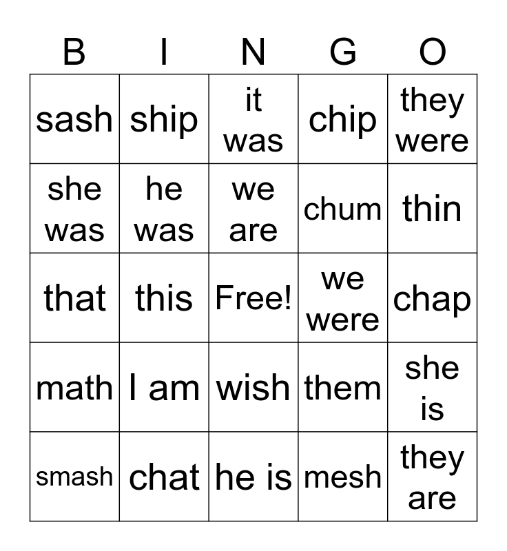 This bingo card has a free space and 24 words: I am, chat, we are, smash, they were, sash, she was, ship, we were, wish, chum, that, them, she is, he was, mesh, chap, it was, thin, this, they are, math, chip and he is.