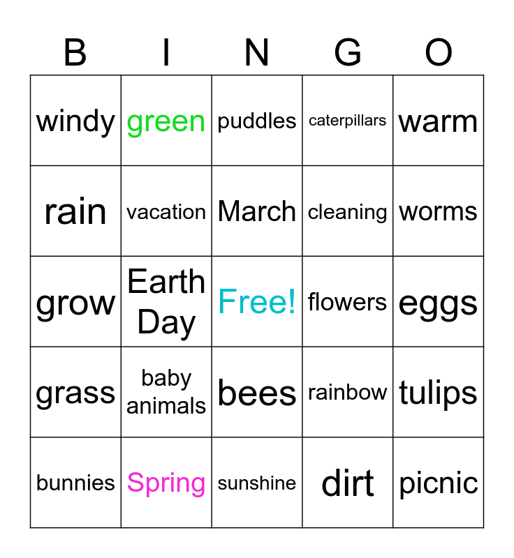 This bingo card has a free space and 24 words: baby animals, Spring, March, bunnies, warm, windy, rain, green, flowers, bees, cleaning, grow, rainbow, tulips, vacation, dirt, eggs, puddles, worms, Earth Day, picnic, grass, caterpillars and sunshine.